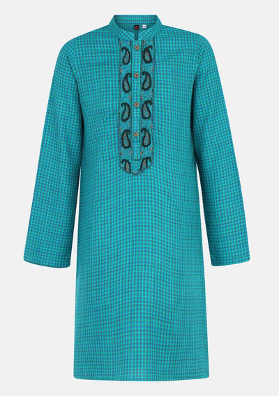 - urquoise checked viscose-ramie cotton panjabi with shades of green, turquoise and golden erri embroidery.