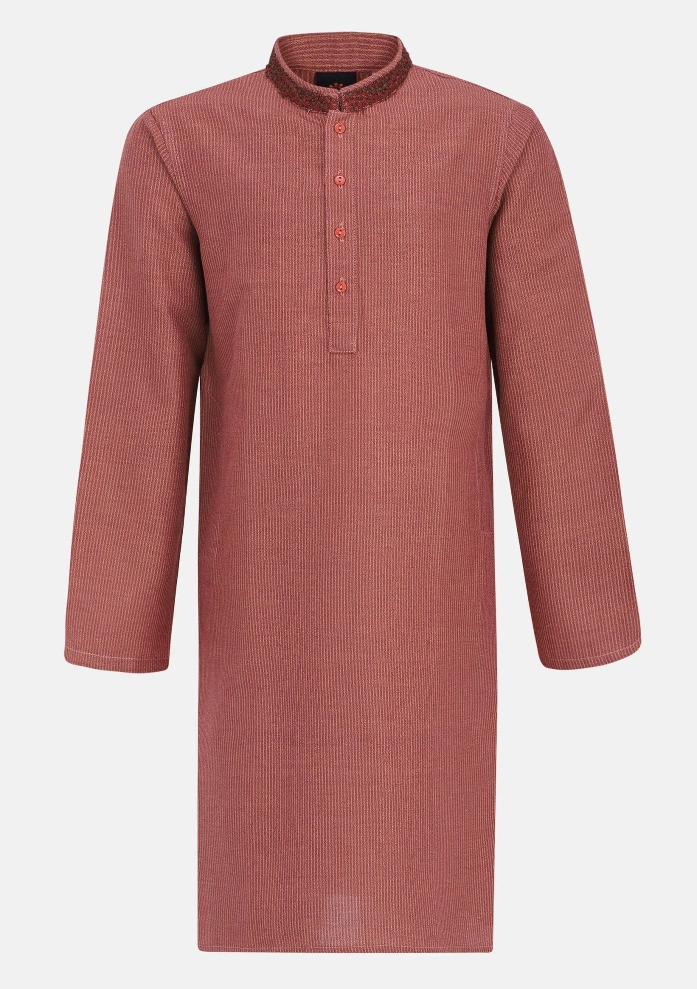 - Purple and yellow ochre striped handloom cotton panjabi with erri embroidery.
