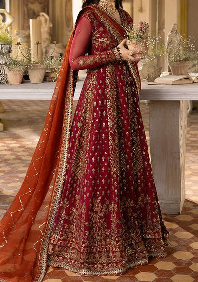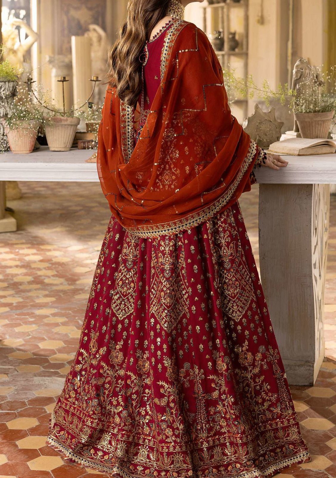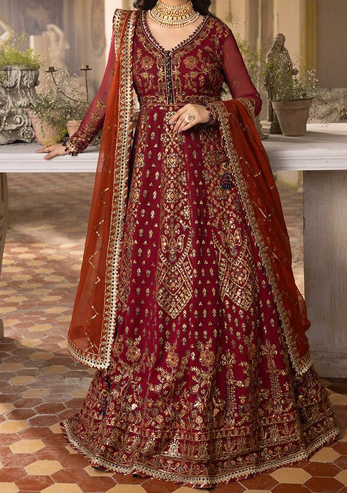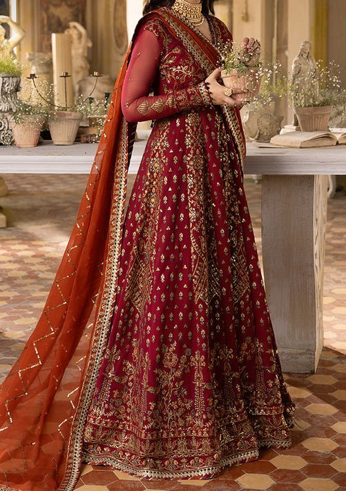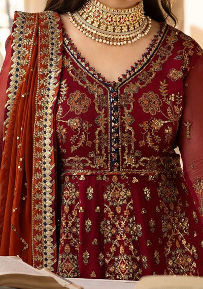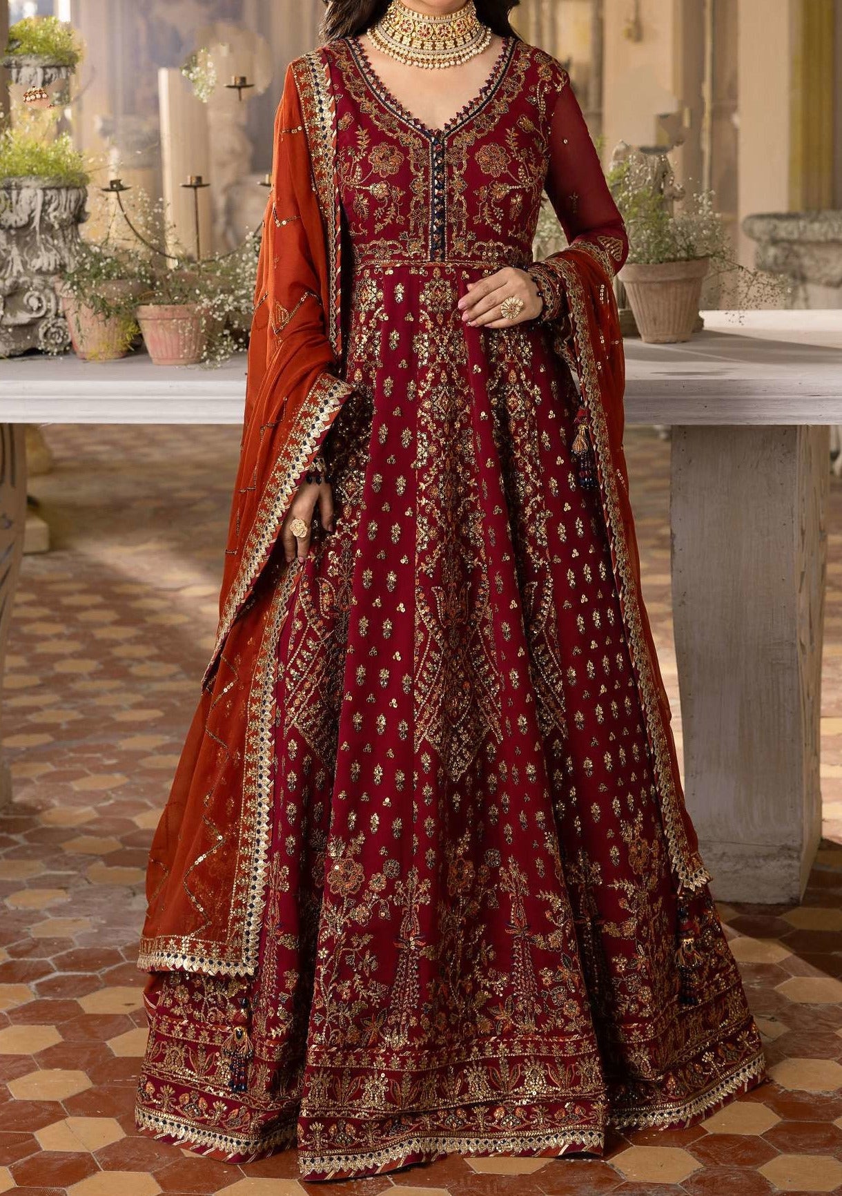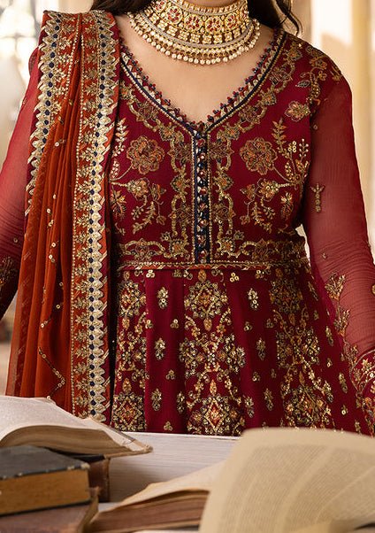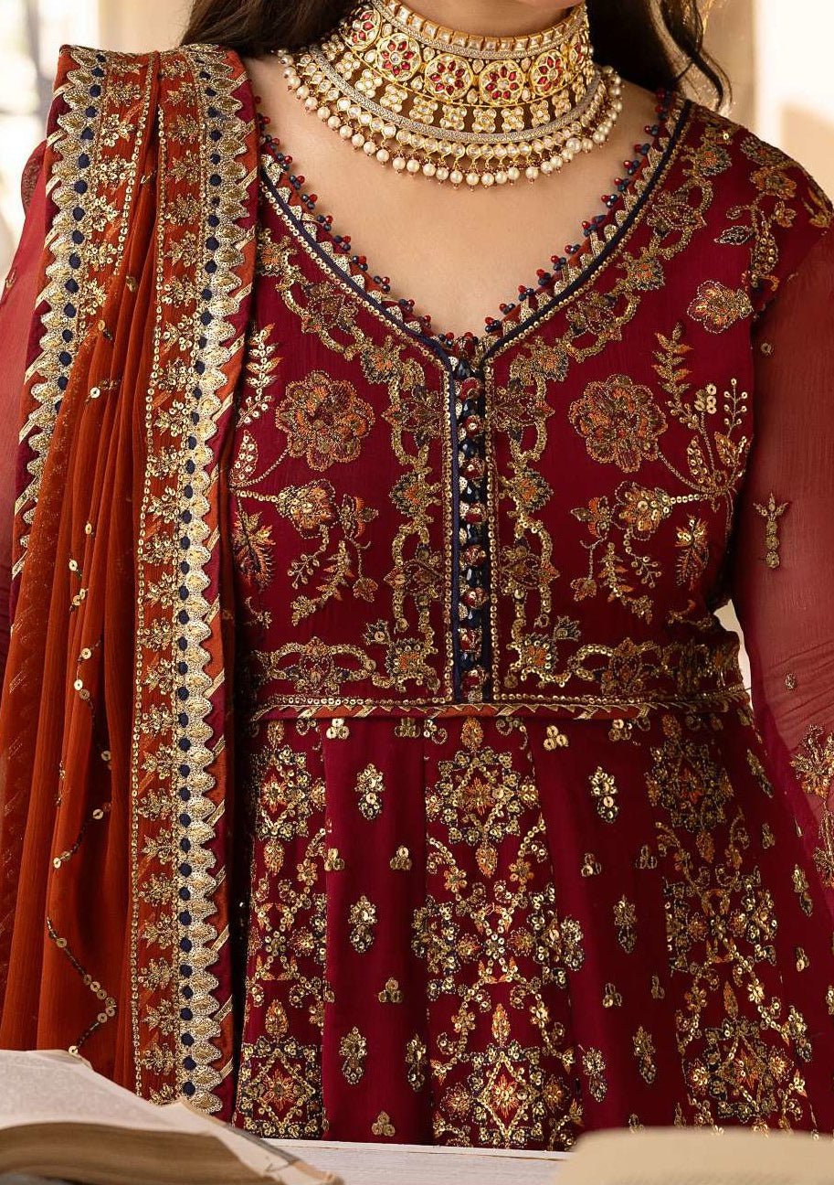 Introducing our Luxury collection 'KHWAB-E-NAUBAHAR' by Asim Jofa designed to make you look and feel your best these pieces will add a touch of class and elegance to your wardrobe. Experience a Rouge Rhapsody in Bloom with this captivating red peshwas, a floral masterpiece from "Khwab-E-Naubahar." Antique gold zari, maroon, navy blue, and rust threadwork adorned with 5mm sequins and 3mm spangles blossom across the bodice creating a rhapsody of Indian blooms. The embroidered kalis are a garden in full bloom and the ghera's embroidered border is a celebration of nature's grandeur. As you drape the rust-hued dupatta, adorned with four side borders, you become the queen of a poetic rhapsody a garden of dreams in shades of rouge.
