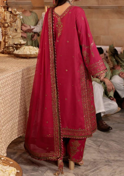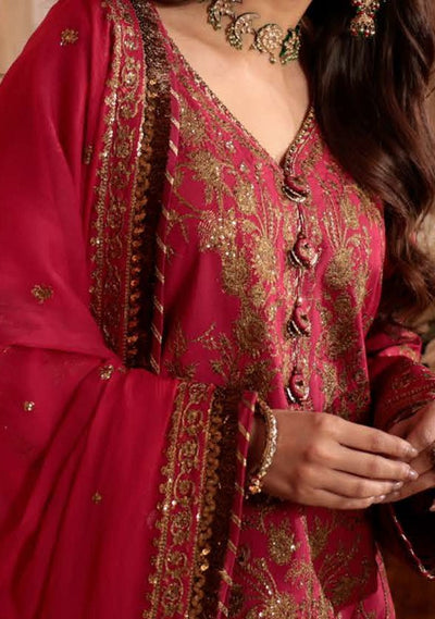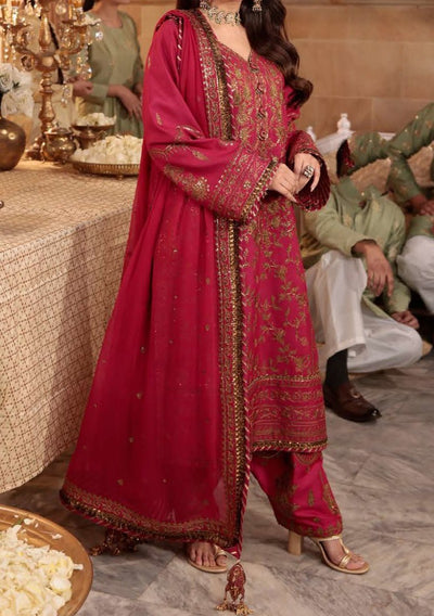 Introducing our Luxury collection 'SHEHNAI FESTIVE' by Asim Jofa designed to make you look and feel your best. these pieces will add a touch of class and elegance to your wardrobe. Step into elegance with our Magenta Elegance Affair, where traditional aesthetics meet modern design. The intricate gold zariwork and 3mm sequins on the embroidered front center panel, side panels and sleeves create a harmonious visual delight. The embroidered border for the front and chaak along with the embroidered back neckline and back with border add a regal touch. Complete the look with the embroidered dupatta featuring four side borders and a bordered trouser making this ensemble an affair to remember.