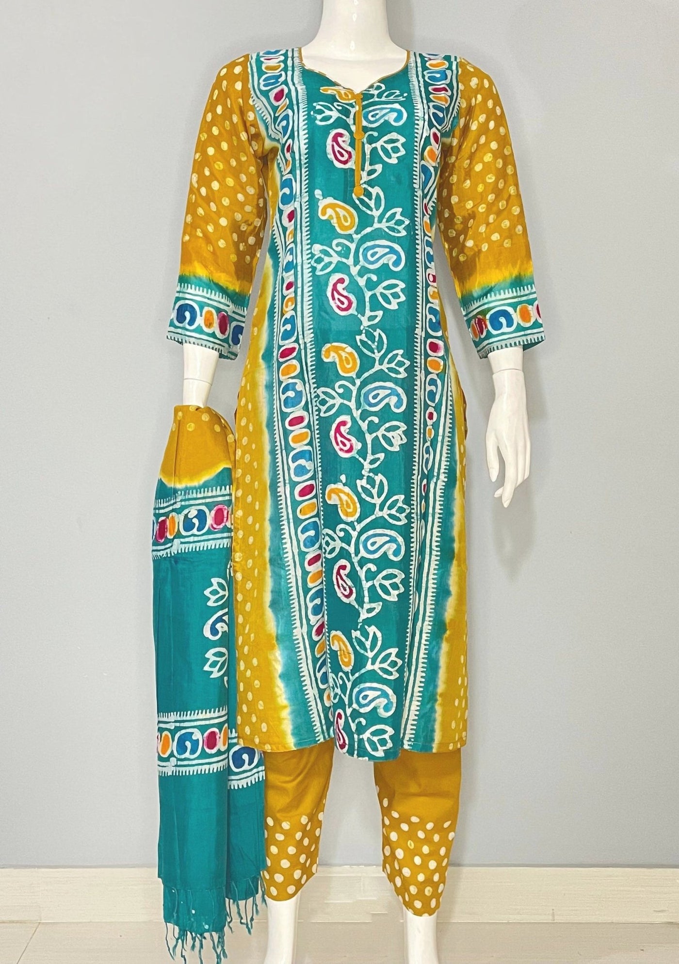 Featuring everyday use soft design in 3 pieces of batik-printed silk salwar kameez suits.