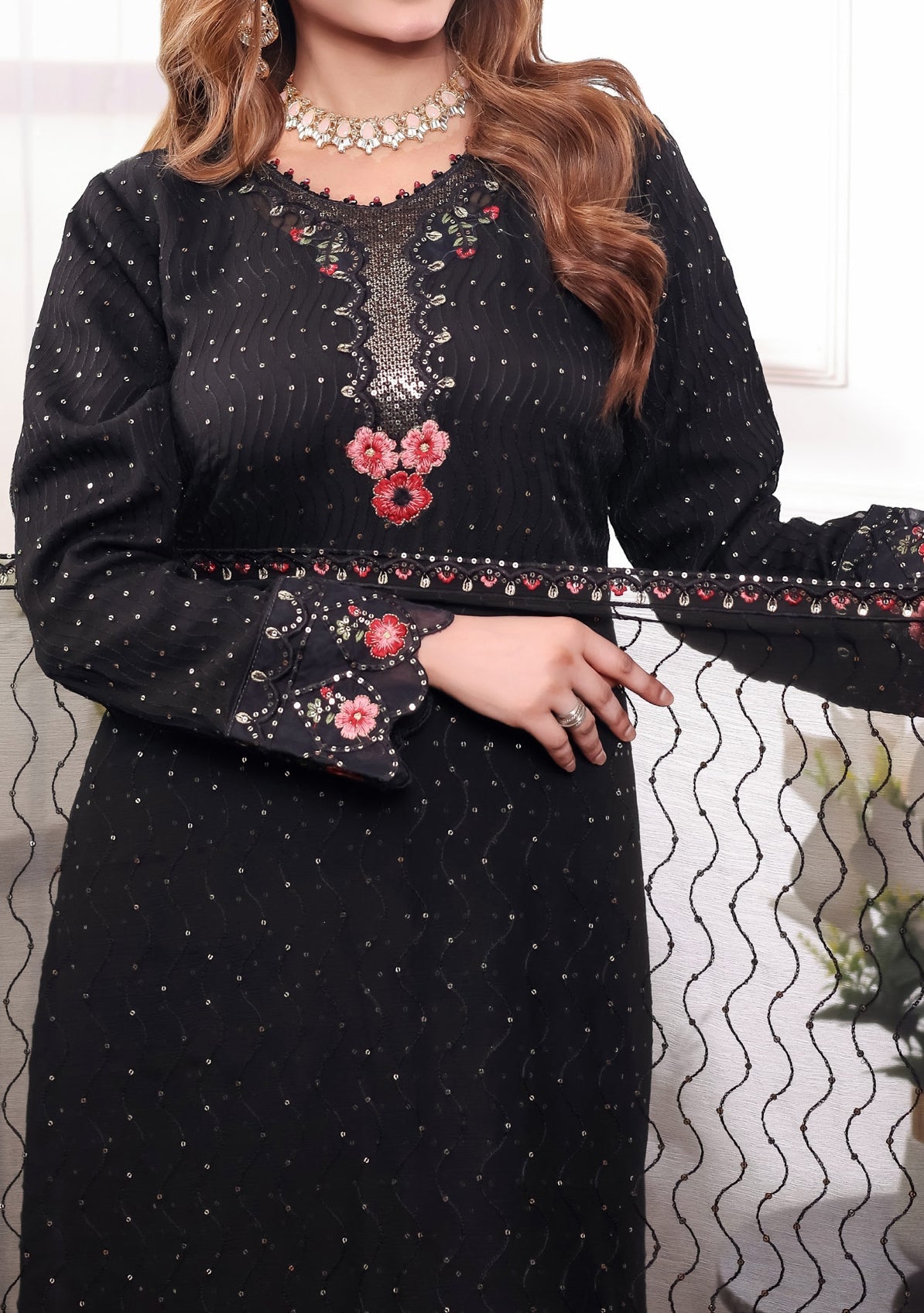 • Embroidered Chiffon Dupatta With Border Work.