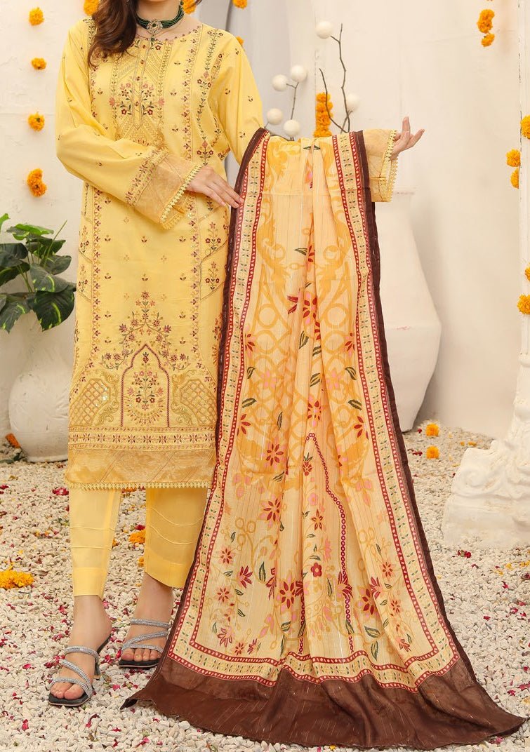 Includes: Ready-Made Kameez, Trouser, and Dupatta.