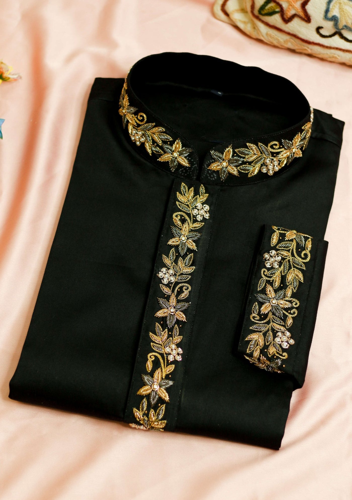 • Embroidered collar and cuff design.