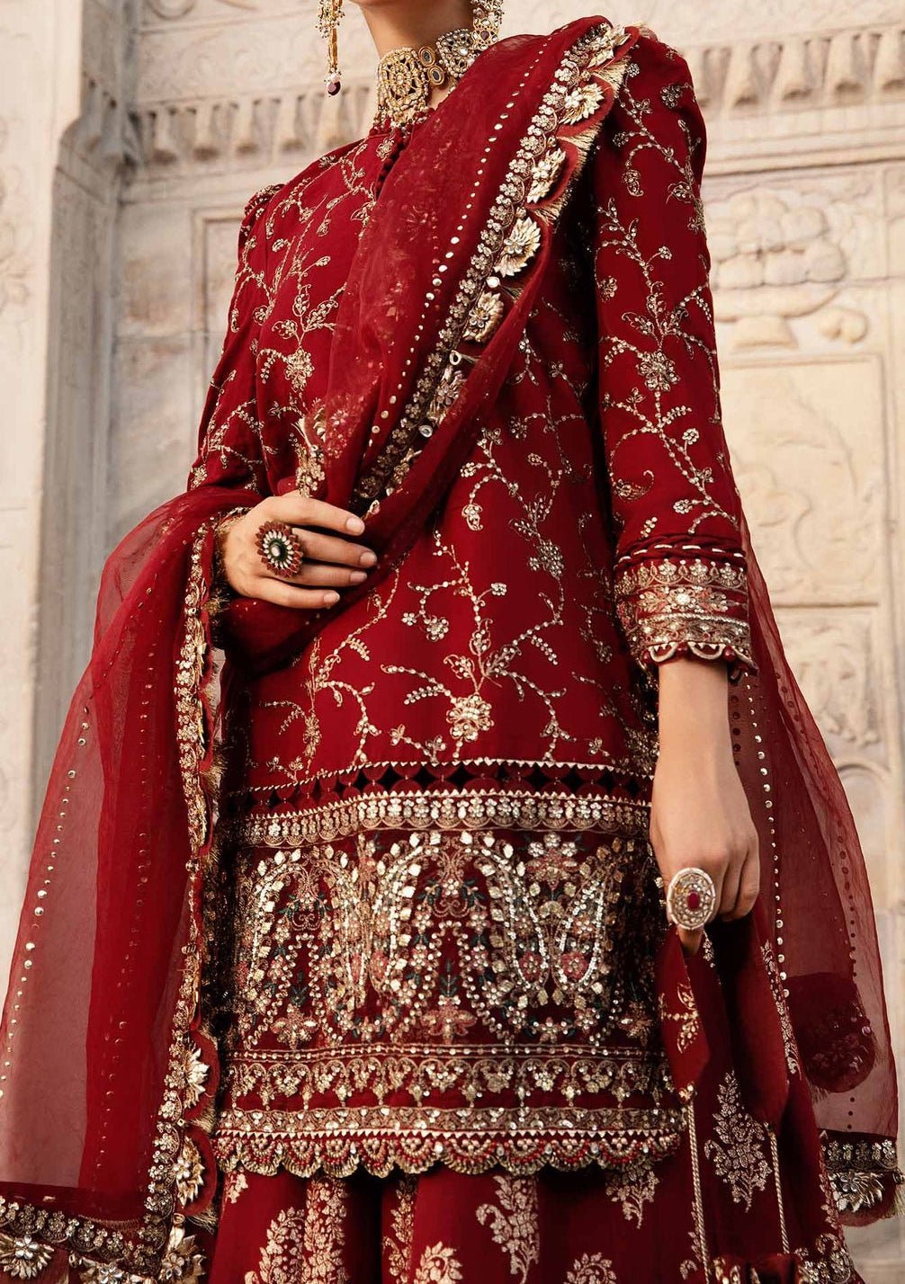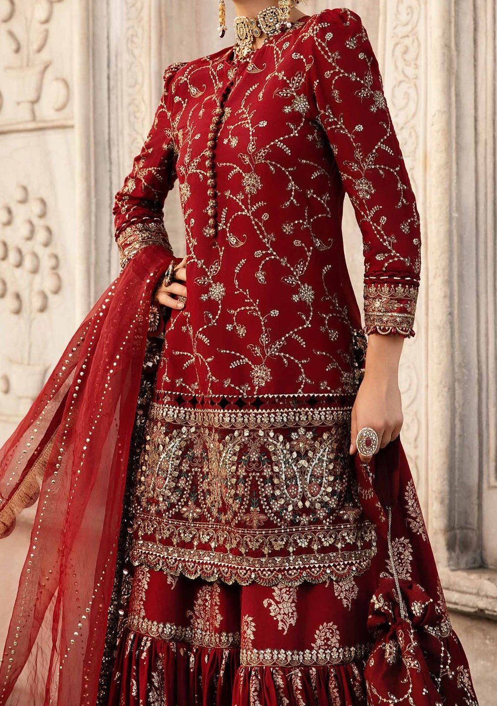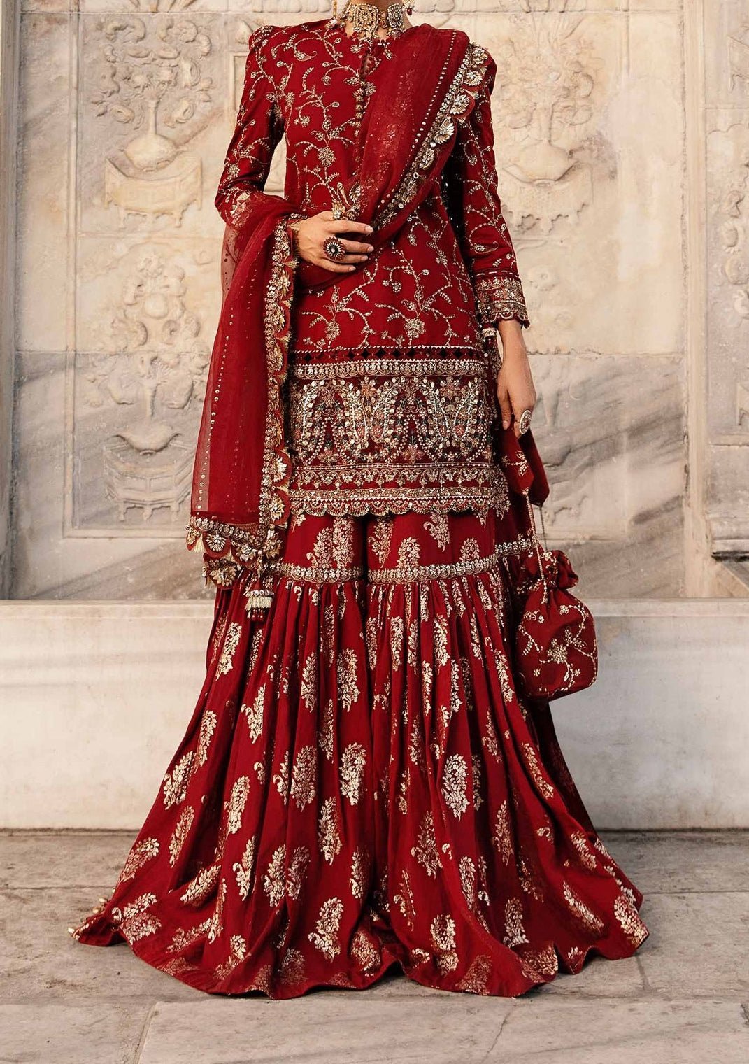 Includes: Kameez, Sharara, and Dupatta.
